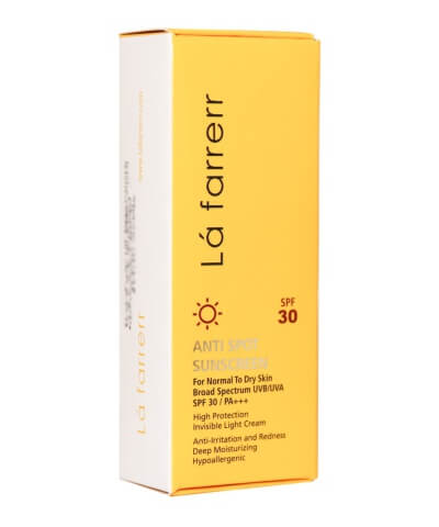 - کرم ضد آفتاب و ضد لک بی رنگ پوست خشک لافارر حاوی عصاره شیرین بیان و بیربری